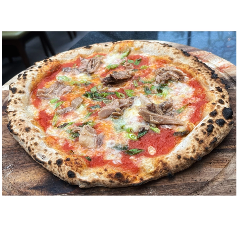 -Tomatensaus, fiordilatte kaas, Siciliaanse tonijn, kappertjes, olijven, rode ui-Tomato sauce, fiordilatte cheese, Sicilian tuna, capers, olives, red onion0