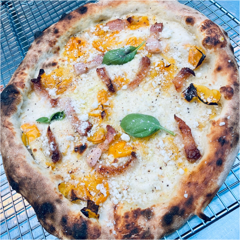 -Gele tomaatjes, pancetta, gerookte scamorza kaas, Parmigiano, pecorino, basilicum, peterselie, knoflook;-Yellow cherry tomatoes, pancetta, smoked scamorza cheese, Parmigiano, pecorino, basil,parsley, garlic0