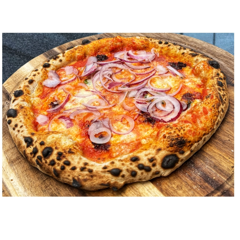 -Tomatensaus, fiordilatte kaas, ‘nduja’(pittig creme), gerookte scamorza kaas, kappertjes, rode ui-Tomato sauce, fiordilatte cheese, 'nduja'(spicy pork creme), smoked scamorza cheese, capers,red onion0